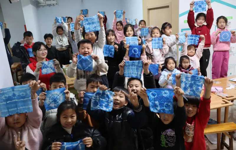 图为孩子们与成员们的扎染效果展示 郝一诺 供图