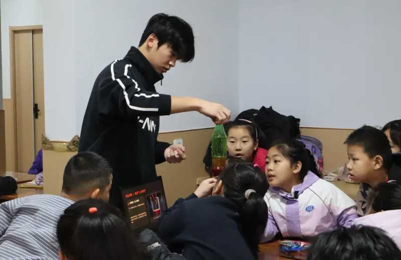 图为队员向孩子们演示“油水火山”实验 郝一诺 供图