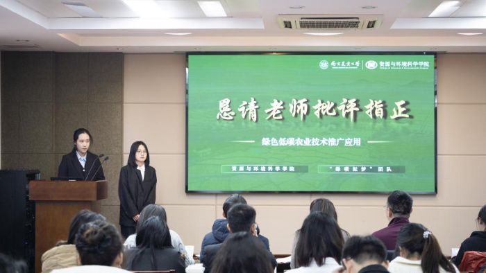 决赛现场,各参赛队伍围绕自身调研成果与实践案例,通过项目汇报、方案展示等形式,系统阐述了兼具科学性、创新性与可行性的绿色低碳发展方案,充分展现了青年学子对农业绿色转型的深入思考。评委老师围绕项目创新点、实践价值及推广前景等方面进行提问,各参赛队伍认真作答,现场交流氛围热烈。