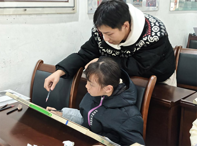 在实操教学环节,谭帅阳现场示范动漫角色绘制步骤,从基础线条勾勒到简单色彩搭配,一步步引导孩子们动手实践。针对孩子们在绘画中遇到的“怎么画眼睛更灵动”“如何设计独特的发型”等问题,谭帅阳与其他志愿者们分组巡回指导,耐心纠正绘画姿势,细致讲解修改建议。孩子们热情高涨,纷纷发挥想象力,有的模仿经典角色进行创意改编,有的自主设计全新动漫形象,笔尖在画纸上灵动跳跃,一张张充满童真与创意的作品逐渐成型。“谭老师讲得太有趣了,我终于知道怎么画我喜欢的动漫人物了!”一名三年级学生举着自己的作品,兴奋地与志愿者分享。