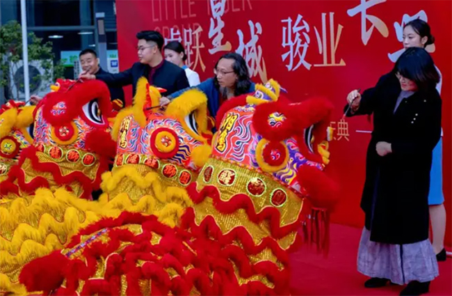 锣鼓铿锵,瑞狮腾跃。小老虎集团董事长陈虎、首席战略官任锌沐、天使投资人兼泌萌生物科技创始人贺翔、天使投资人兼老账房集团董事长刘晓梅手持朱砂笔,为雄狮点睛。“左点金、右点银,中间一点启乾坤”,一点一落,礼炮齐鸣,象征小老虎集团“点睛”数字经济新赛道,也点亮了十万高校青年的创业就业新图景。